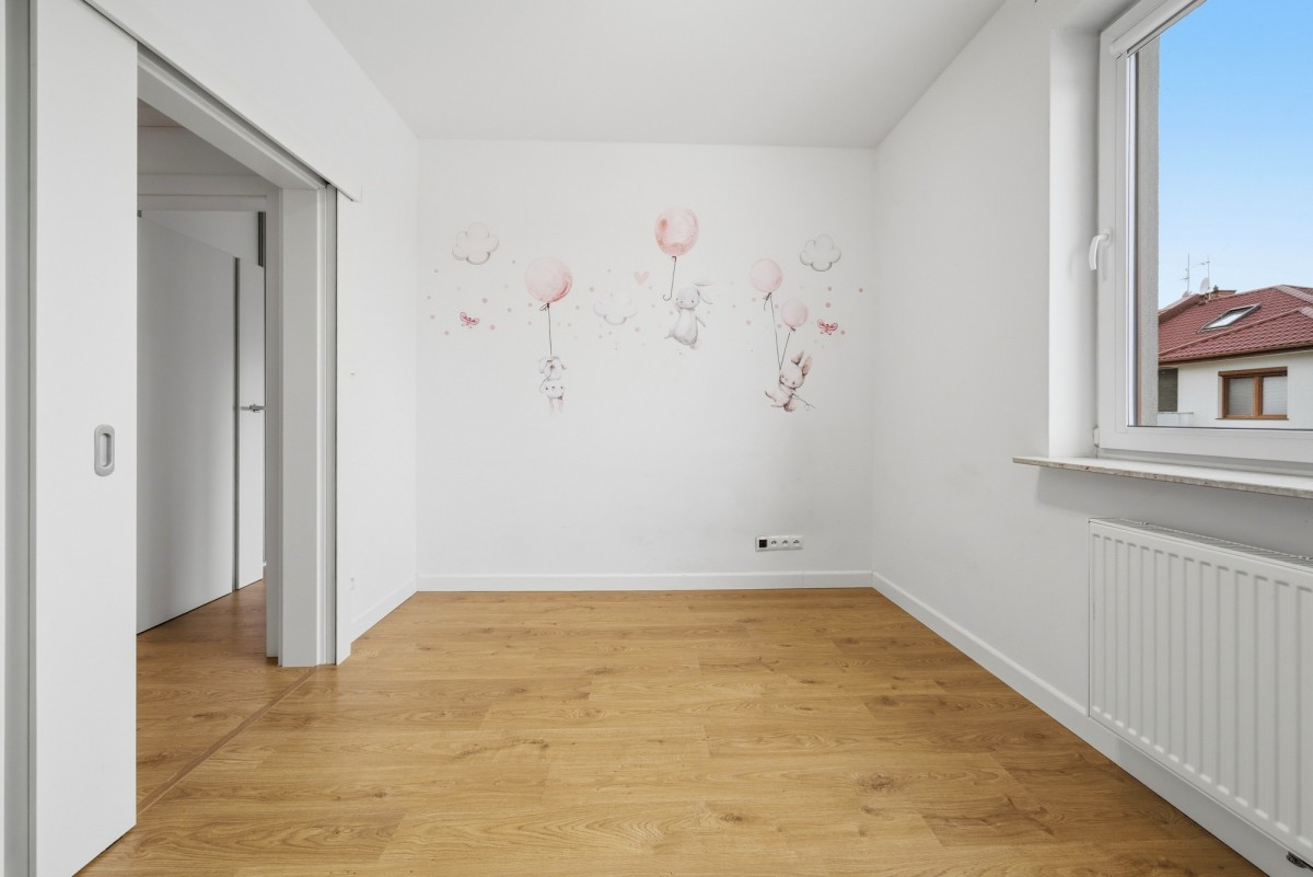 Piętro: 3 sypialnie (w tym jedna z balkonem), garderoba, łazienka z prysznicem, praktyczny schowek, zabudowane szafy
