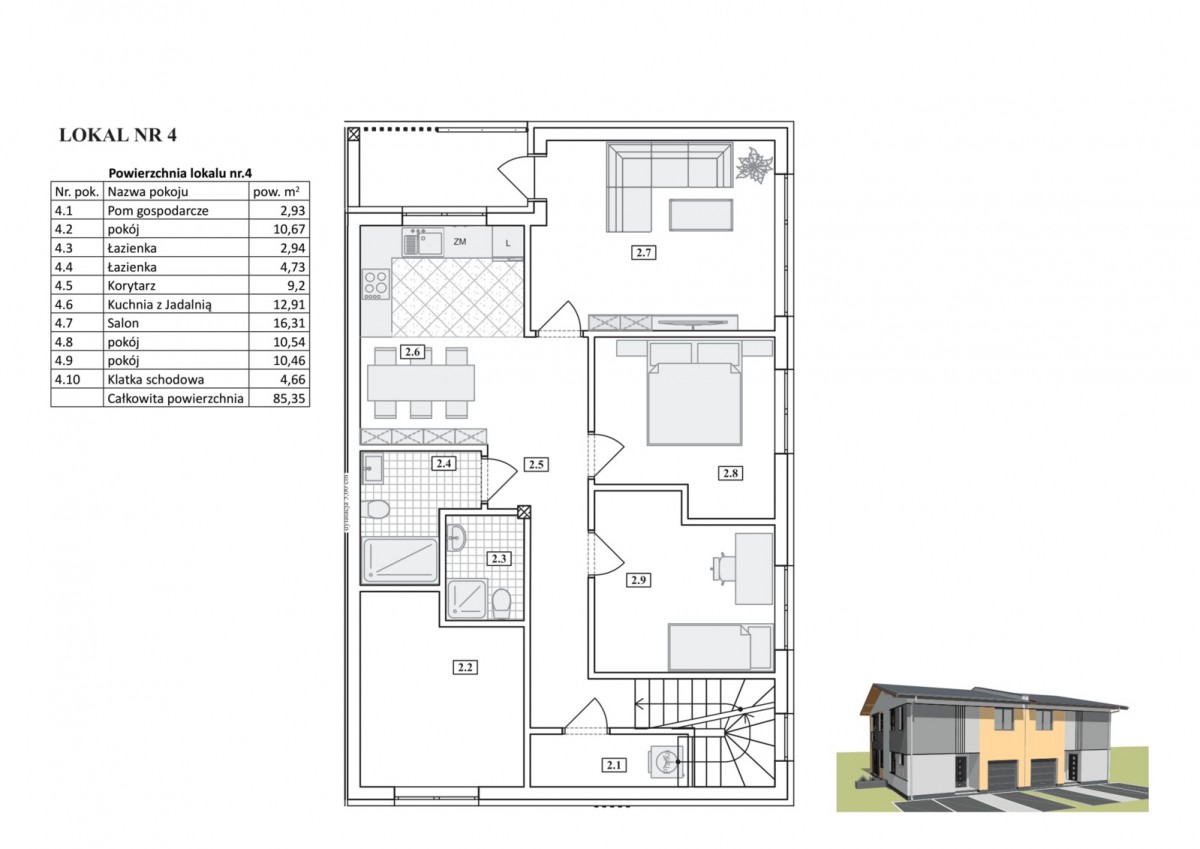 Prezentujemy Państwu wyjątkową ofertę sprzedaży bezczynszowego lokalu mieszkalnego o powierzchni 85,35 m2, stanowiącego idealne połączenie przestrzeni domu jednorodzinnego z wygodą mieszkania. Nieruchomość usytuowana jest na piętrze nowoczesnego, dwulokalowego budynku w zabudowie bliźniaczej, co gwarantuje kameralność i poczucie prywatności.