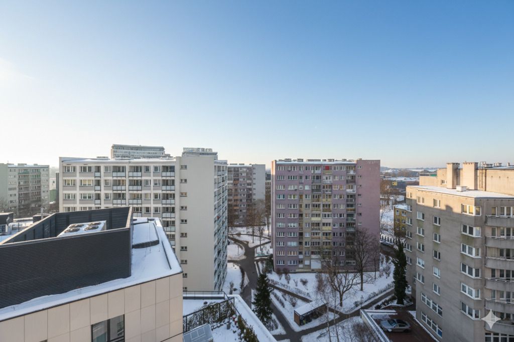 Mieszkanie jest dwustronne (wschód – północ) i narożne, dzięki czemu wnętrza są bardzo dobrze doświetlone. Duże przeszklenia — okno o powierzchni ok. 4 m² w salonie oraz 3,6 m² w sypialni — potęgują efekt światła i przestrzeni. Z okien rozciąga się otwarty widok na miasto, w tym Stadion Narodowy, co stanowi rzadki atut w tej części Warszawy.