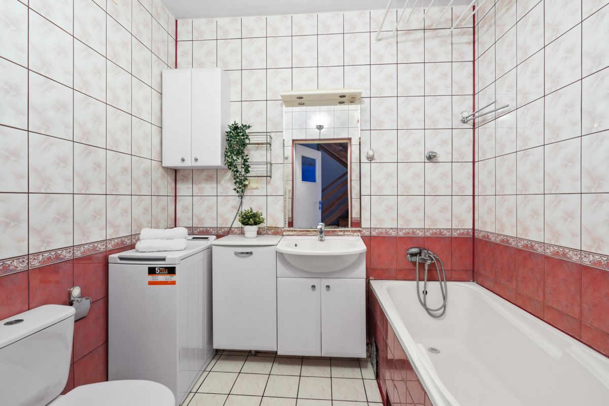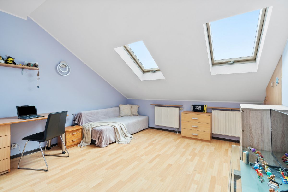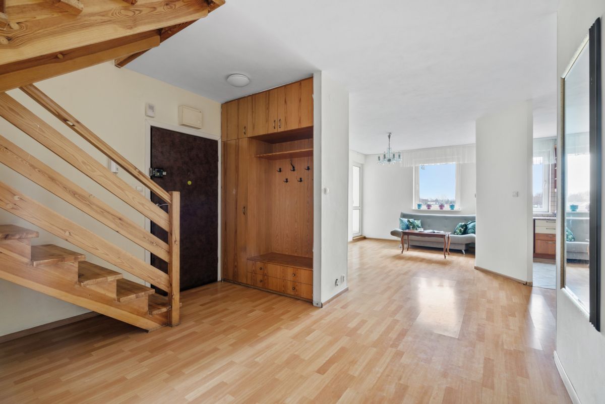 Drugi poziom to bardziej prywatna część mieszkania - duża sypialnia, dodatkowy pokój, który może pełnić funkcję gabinetu lub pokoju dziecięcego, oraz łazienka z prysznicem. Przemyślany układ daje szerokie możliwości aranżacyjne - od stworzenia garderoby, przez powiększenie łazienki, aż po wydzielenie dwóch niezależnych mieszkań.