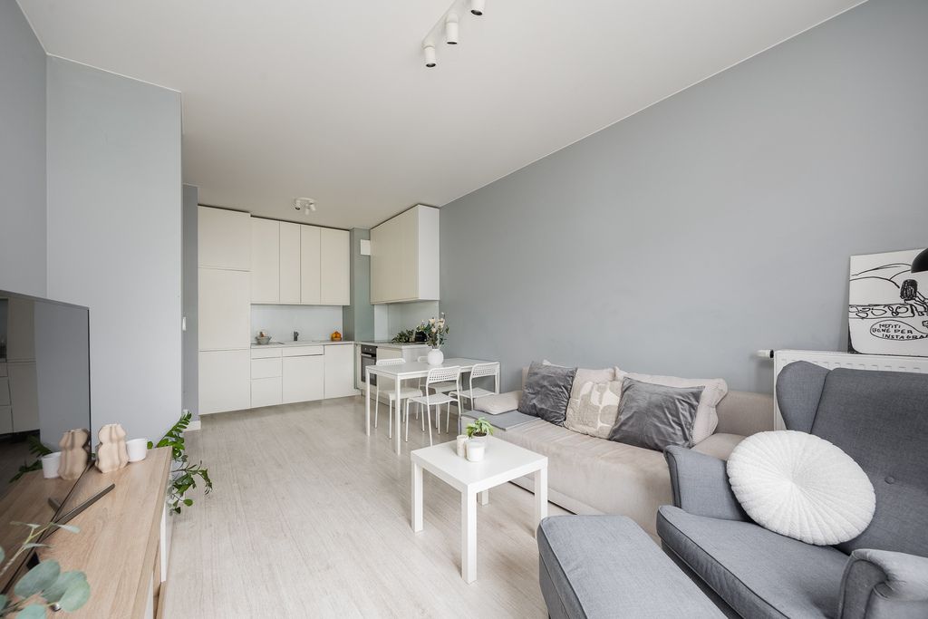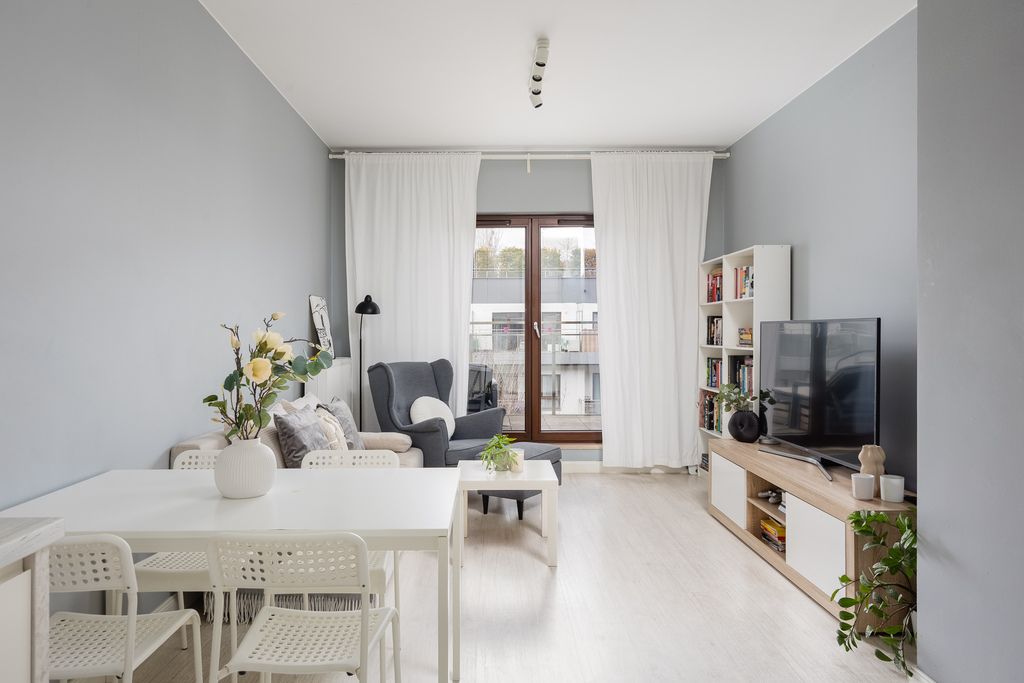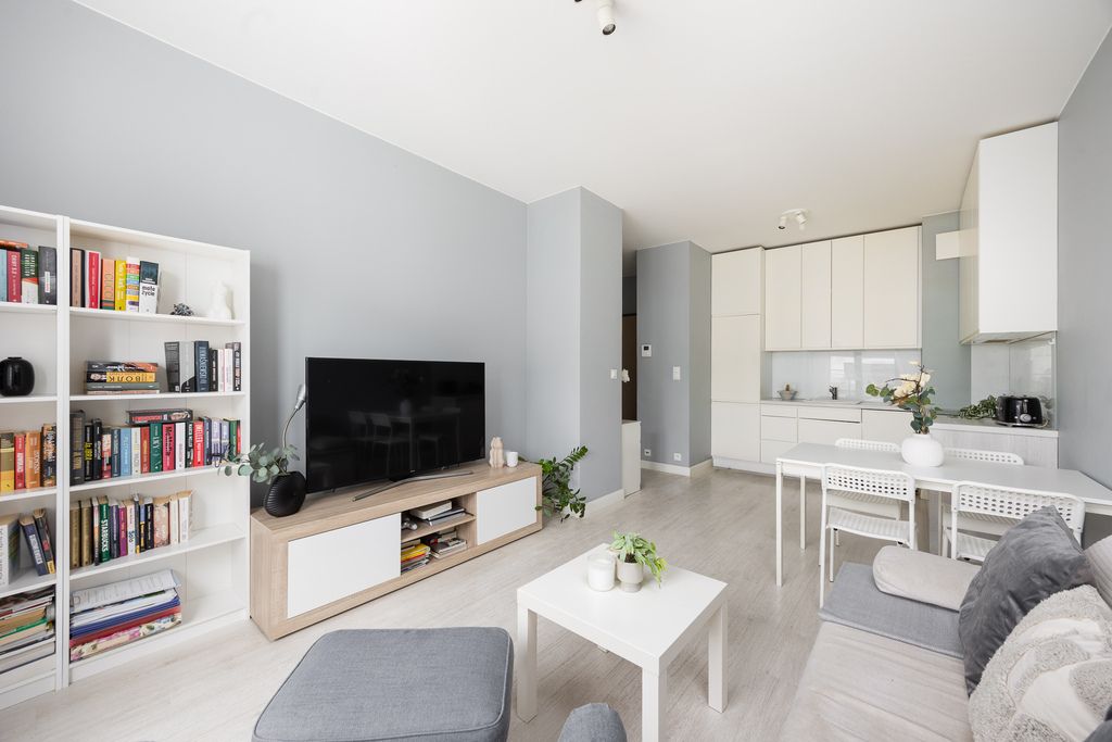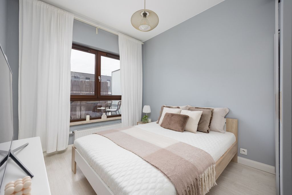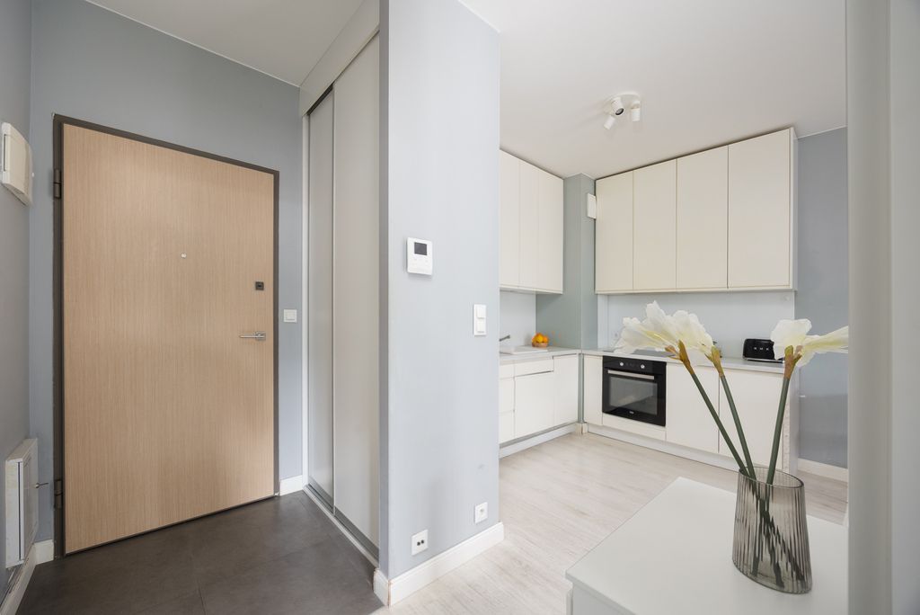 Salon połączony jest z otwartą kuchnią i stanowi komfortową część dzienną. Kuchnia wyposażona została w meble w zabudowie oraz sprzęt AGD, między innymi płytę indukcyjną, piekarnik, okap, zmywarkę, lodówkę oraz zamrażarkę. W sypialni znajduje się pojemna szafa, a w przedpokoju duża szafa w zabudowie. W łazience znajduje się wanna, toaleta, umywalka oraz pralka. Przedpokój wyposażony w pojemną szafę wnękową.