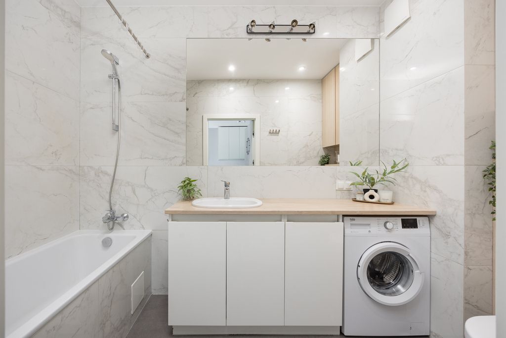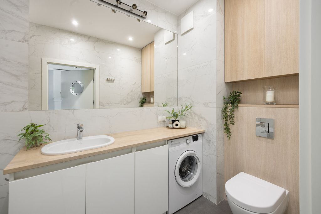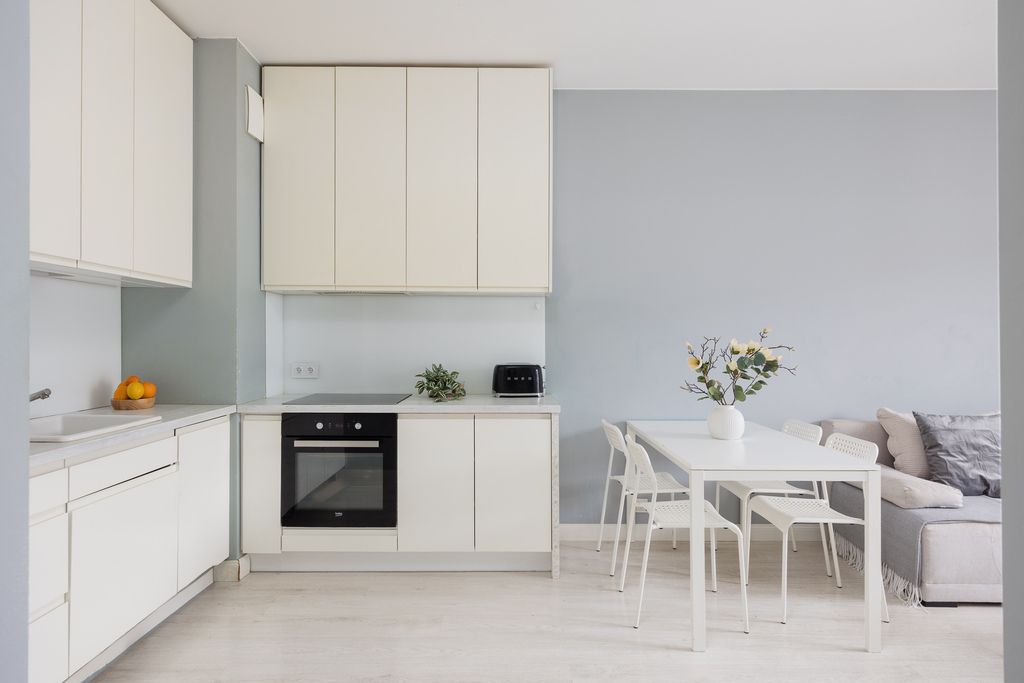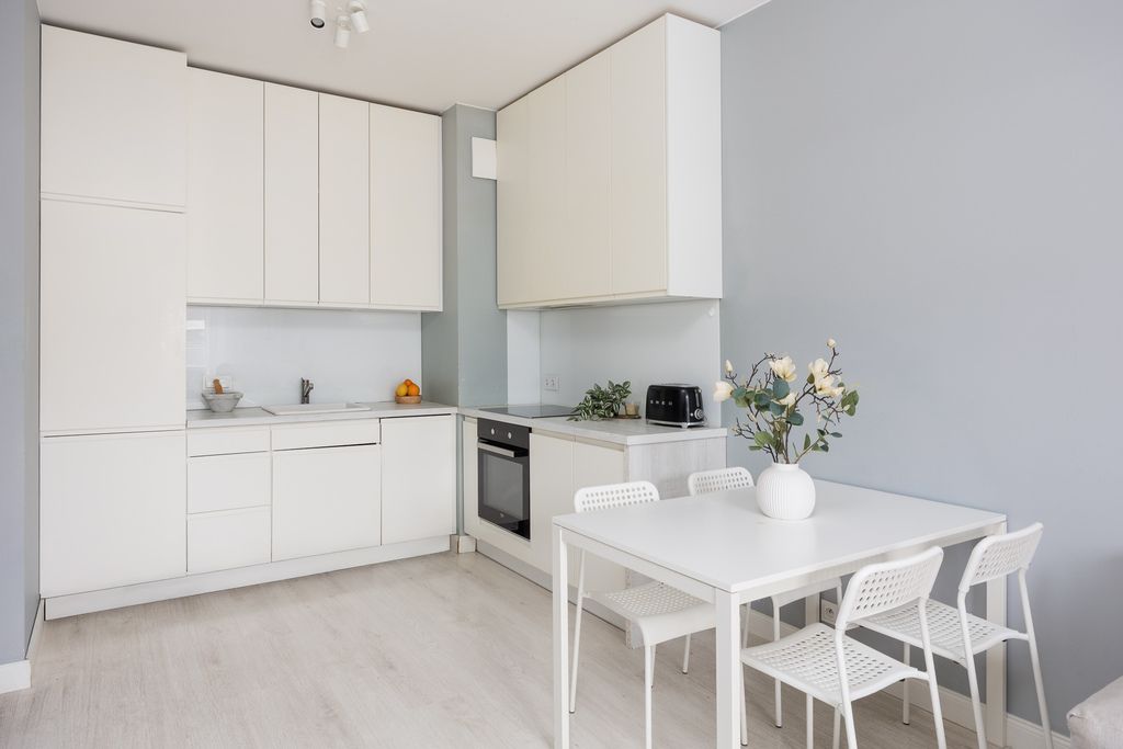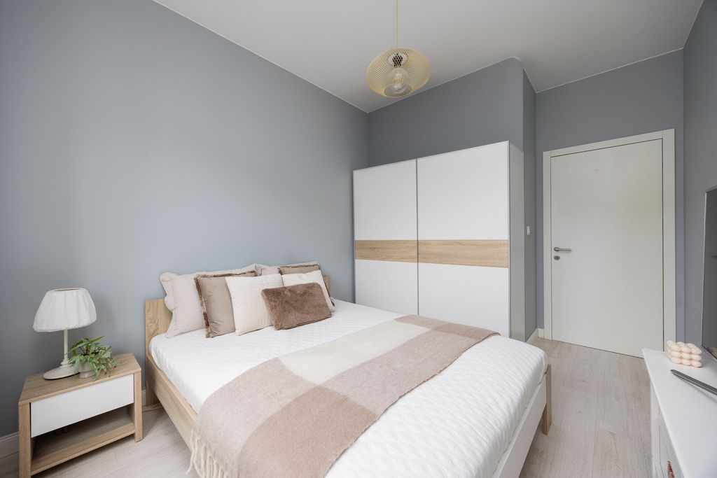 Salon połączony jest z otwartą kuchnią i stanowi komfortową część dzienną. Kuchnia wyposażona została w meble w zabudowie oraz sprzęt AGD, między innymi płytę indukcyjną, piekarnik, okap, zmywarkę, lodówkę oraz zamrażarkę. W sypialni znajduje się pojemna szafa, a w przedpokoju duża szafa w zabudowie. W łazience znajduje się wanna, toaleta, umywalka oraz pralka. Przedpokój wyposażony w pojemną szafę wnękową.