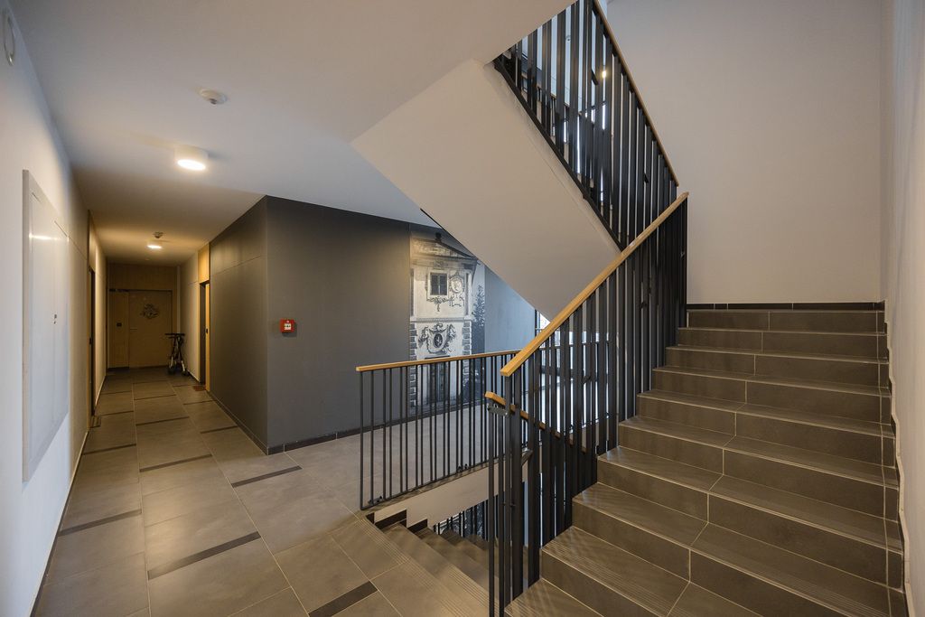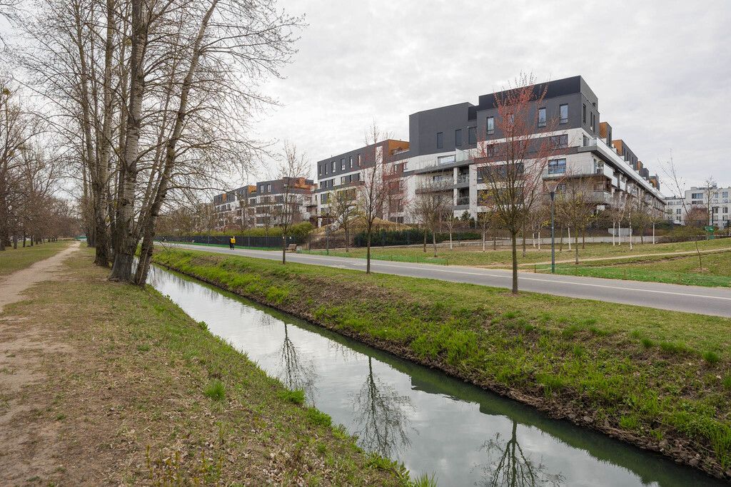 Mieszkanie jest bardzo jasne i słoneczne dzięki zachodniej ekspozycji oraz dużym, drewnianym oknom. Wszystkie okna wychodzą na zielone patio, dzięki czemu mieszkanie jest wyjątkowo ciche i zapewnia prywatność. Wysokość pomieszczeń wynosi około 275 cm, co dodatkowo wpływa na poczucie przestrzeni.