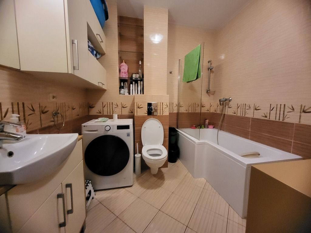 - Łazienki: Komfortowa i czysta, z dużą wanną z parawanem (funkcja prysznica), pralką oraz dużą ilością miejsca do przechowywania.