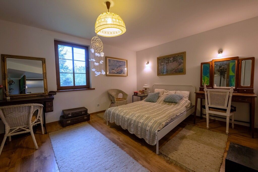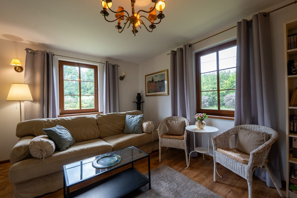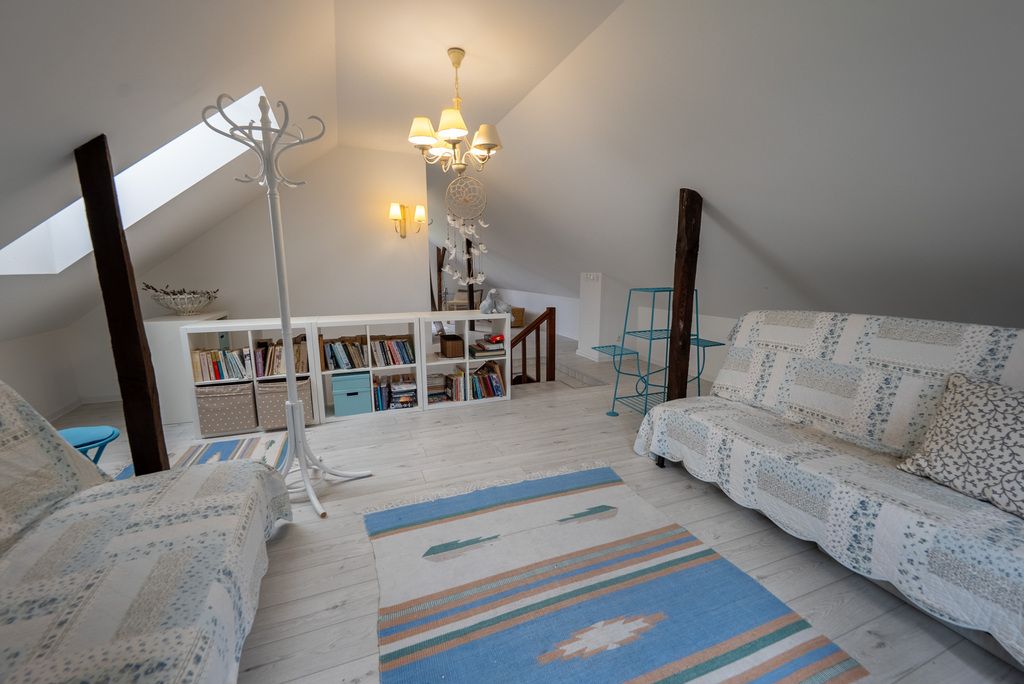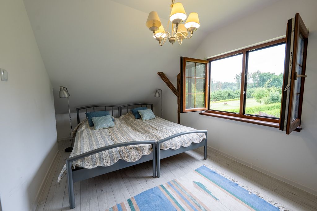 • Poddasze: dwie sypialnie z widokiem na zieleń, łazienka z prysznicem i świetlikiem dachowym. Wnętrza utrzymane w ciepłym, rustykalnym stylu – dużo drewna, naturalne światło, przyjazna atmosfera.